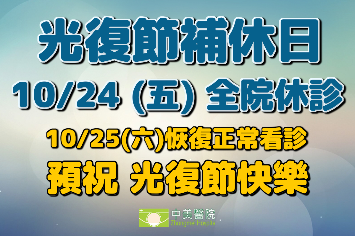本院將於10月24日(星期五)光復節補休日全院停診,10月25日(星期六)恢復正常看診~ 造成不便,敬請見諒!預祝光復節快樂,身體健康