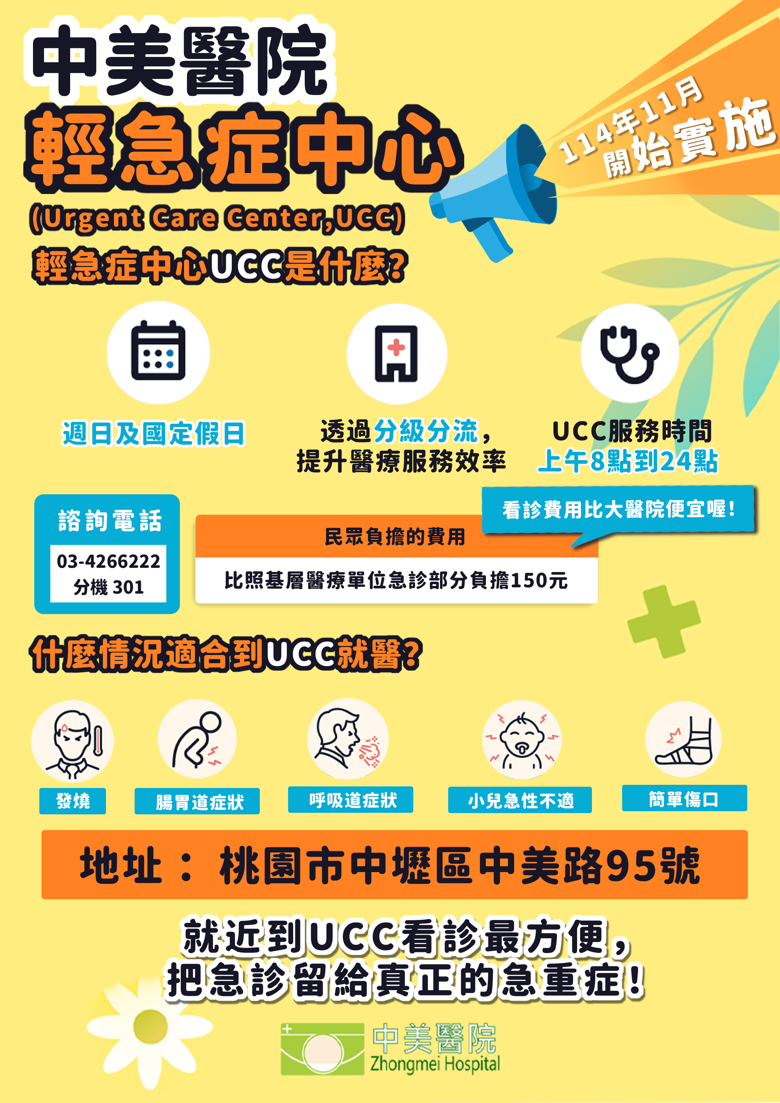 UCC桃園隊 輕急症中心上線囉! 桃園市政府衛生局貼心推出「UCC輕急症中心」,看診收費較便宜(掛號費250元+部分負擔150元),提供內(兒)科、外(骨)科的即時服務,本院為桃園市UCC輕急症中心之一,就近來看診最方便,把急診留給真正的重症!