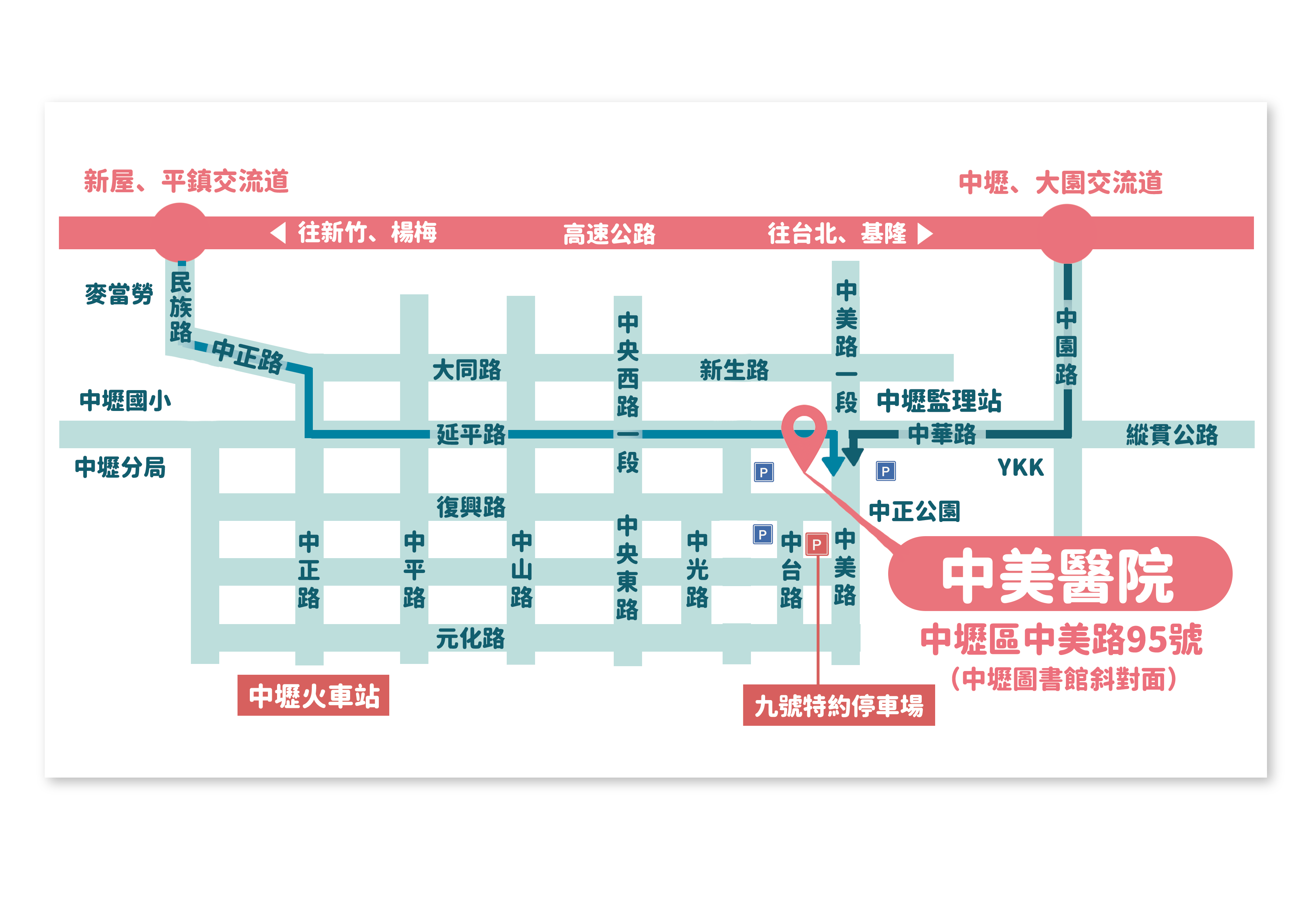 下新屋/平鎮交流道(往中壢方向)→順行中正路→左轉延平路→右轉中美路即可到達。