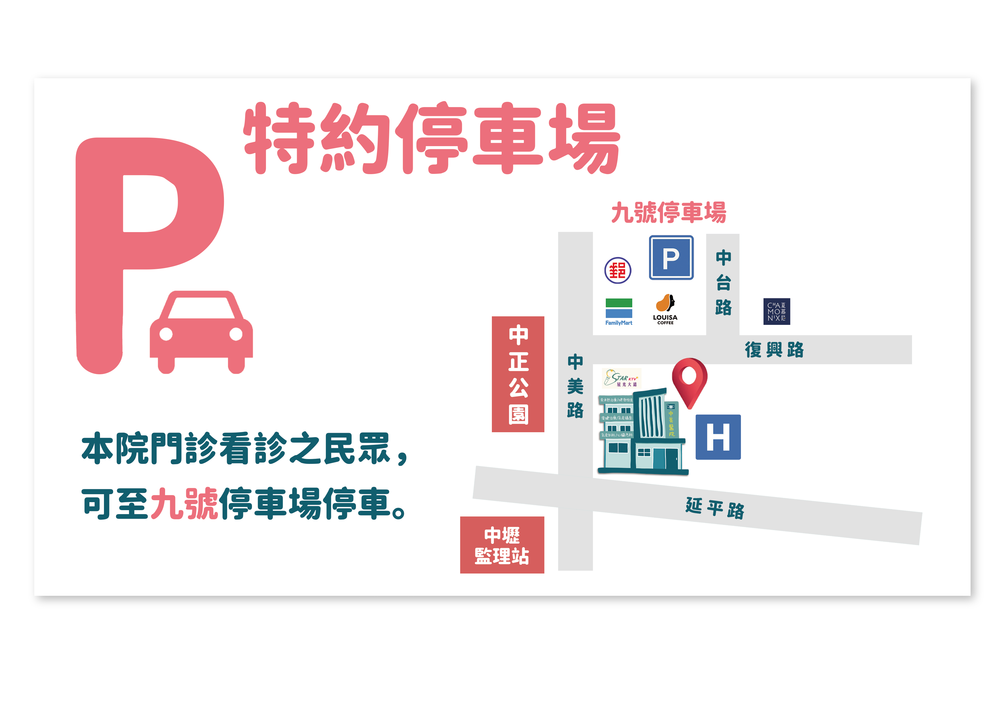 本院門診看診民眾可至九號或復興停車場停車
