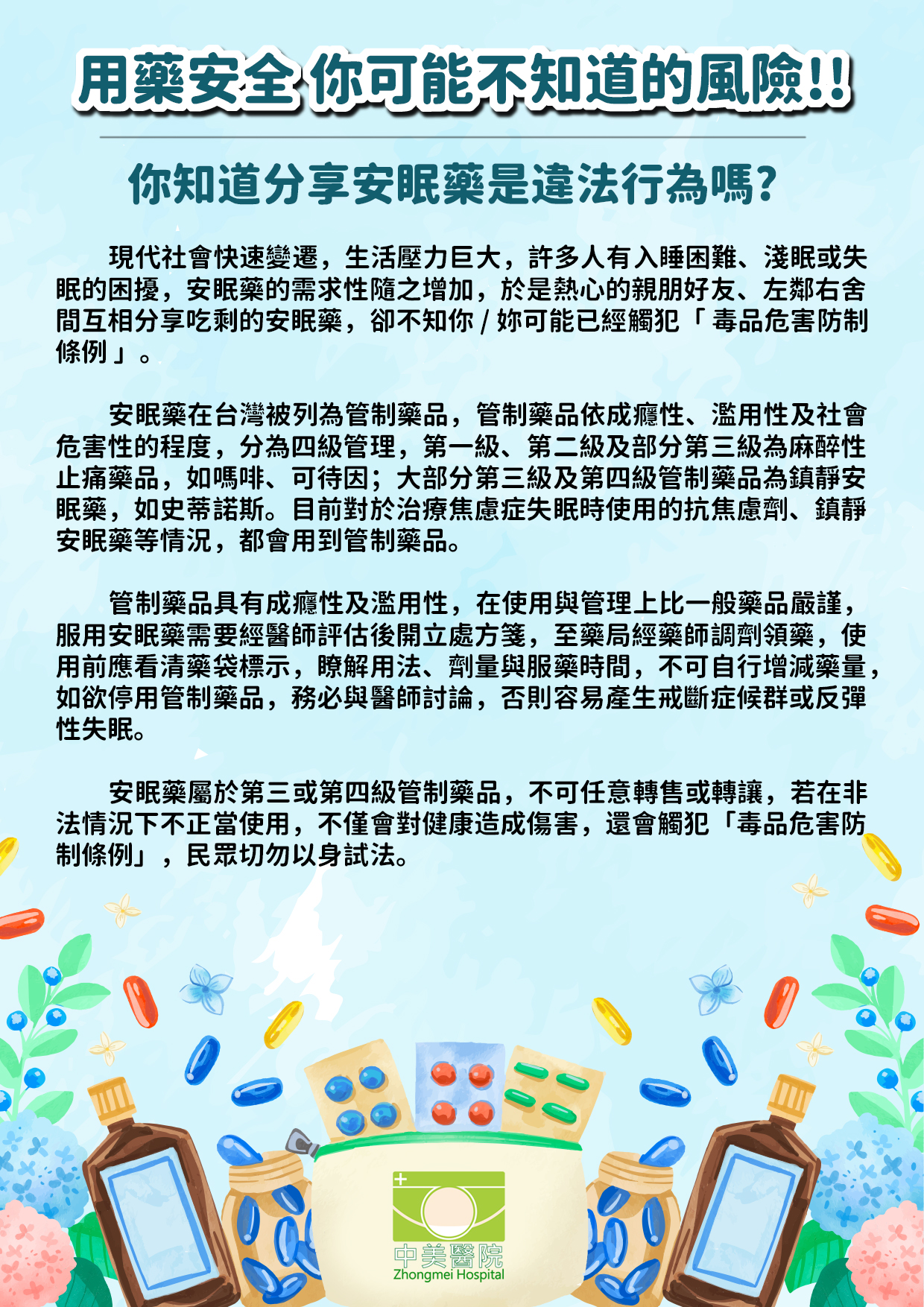 用藥安全,從你我做起~ 安眠藥屬於「管制藥品」,只能由醫師開立、藥師調劑。藥品使用要安全,請依照醫囑,不要私自分享!