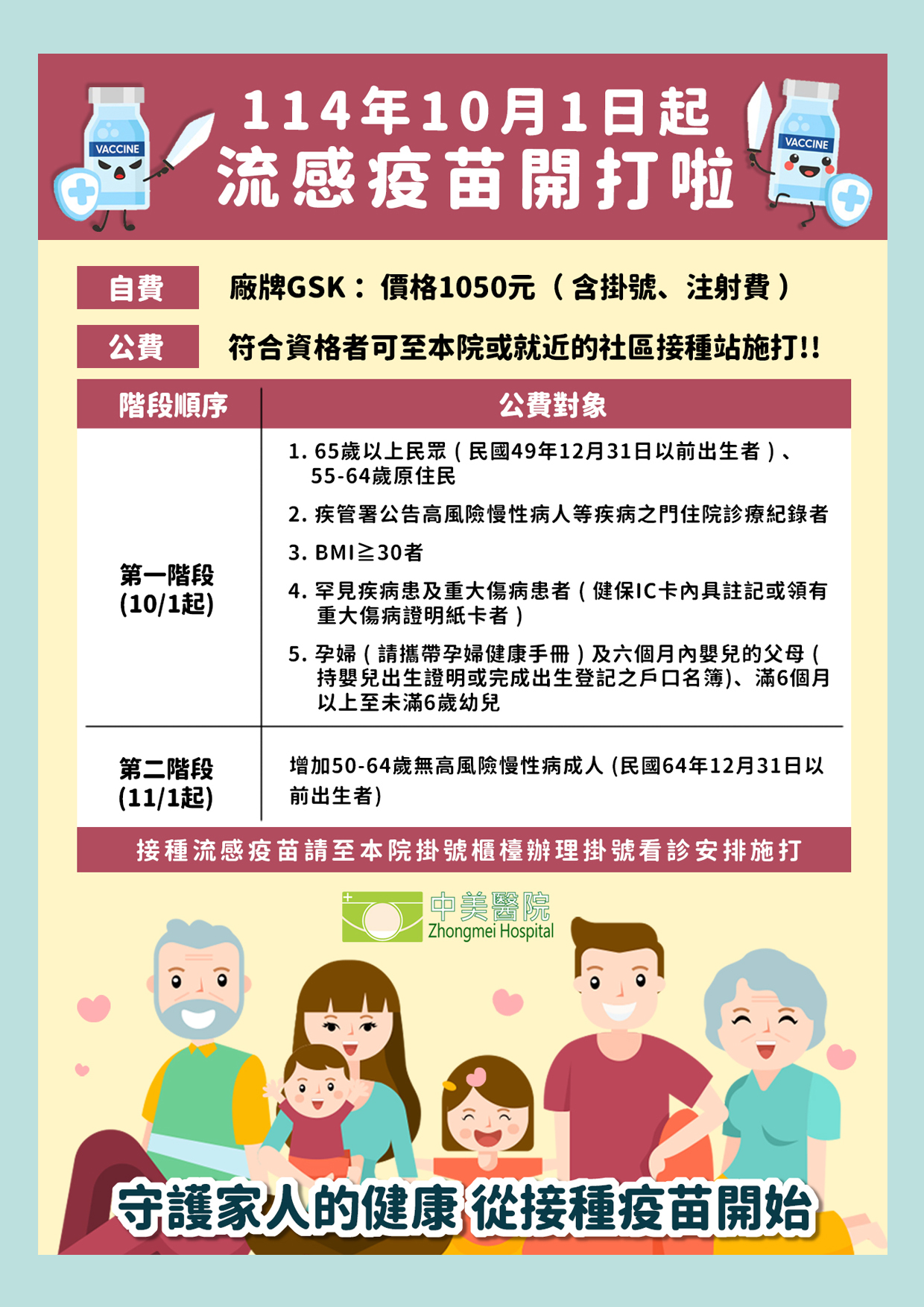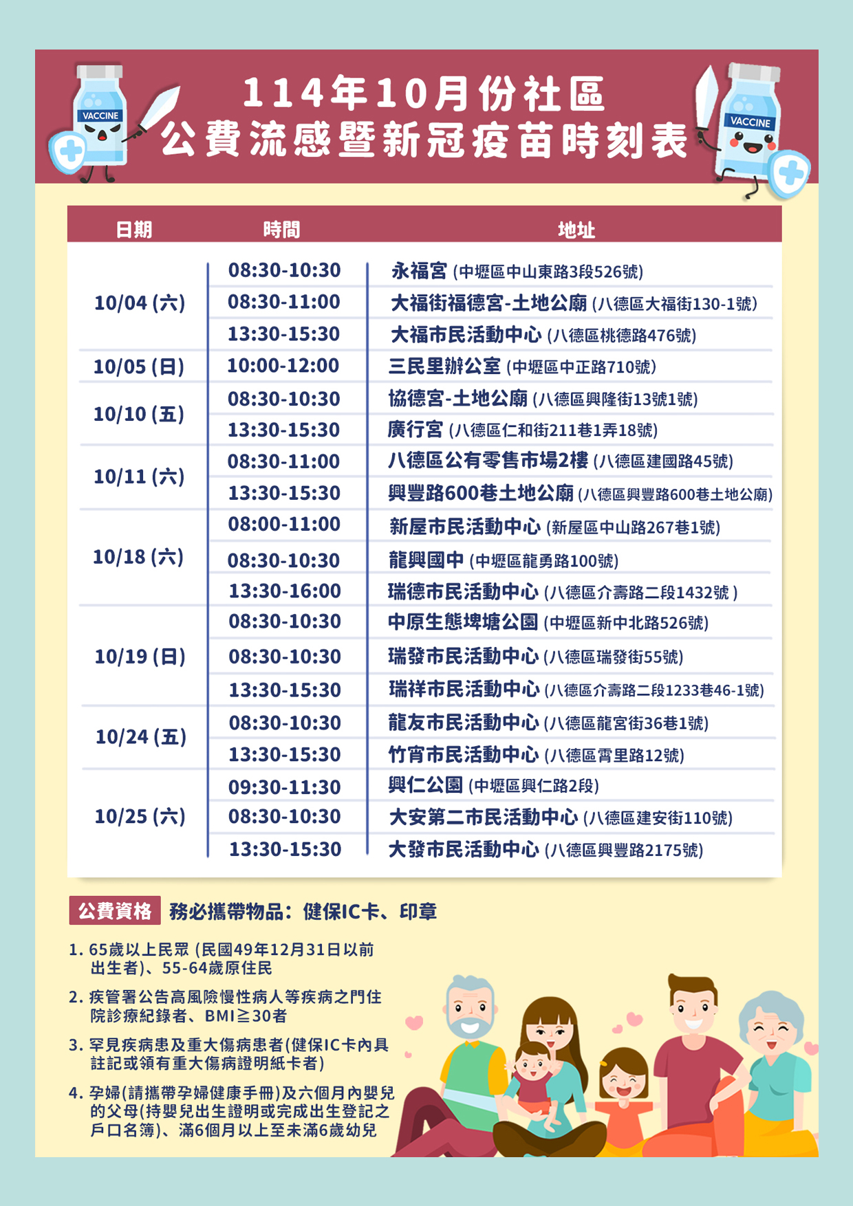 10月1日起,自費及公費流感疫苗正式開打啦~ 提供10月社區流感暨新冠疫苗施打排程,符合資格者,可依照社區時刻表,選擇方便的地點前往施打。及早接種,降低感染與重症風險,為自己、為家人,攜手打造安心社區!