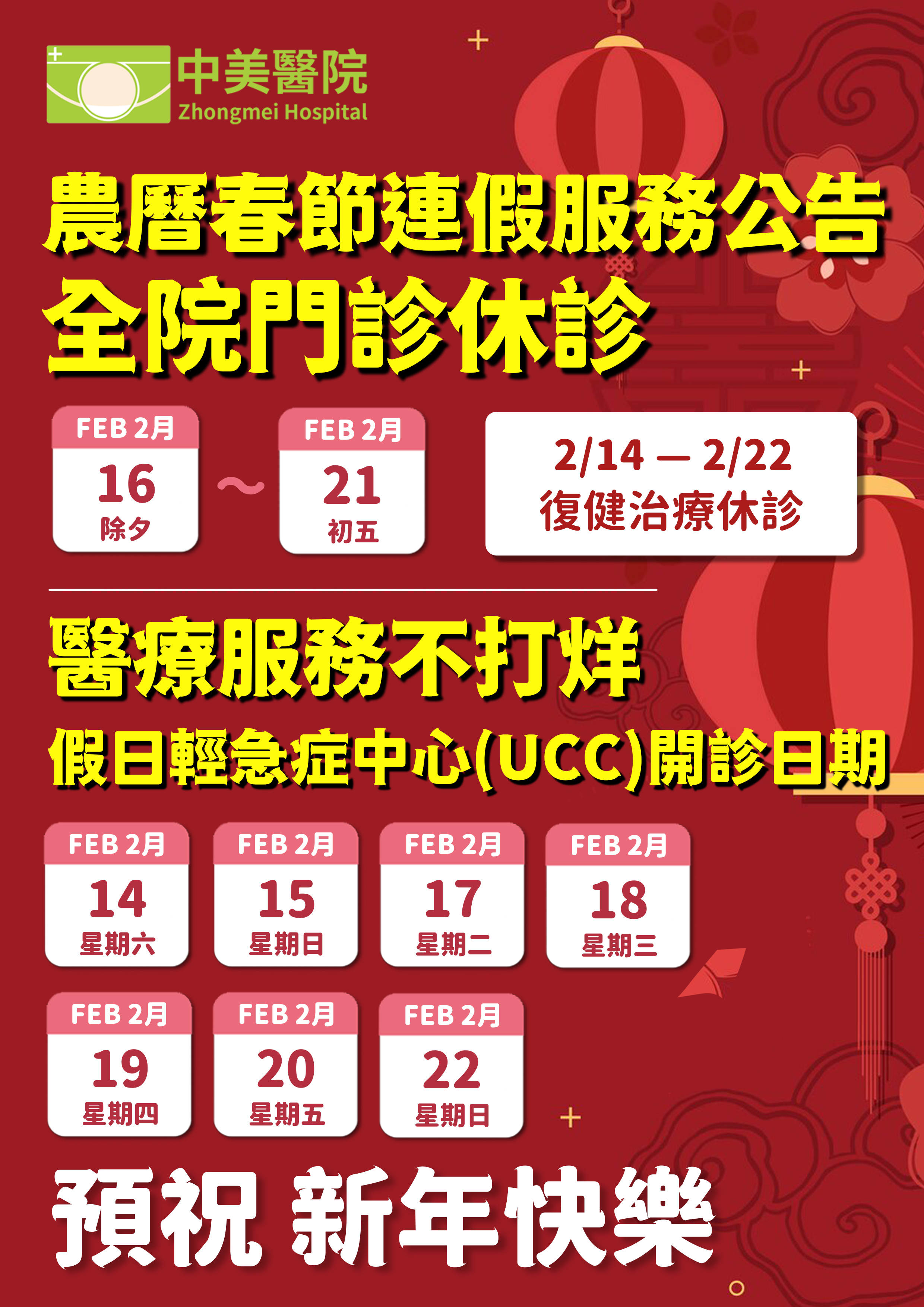 農曆春節連假休診及UCC開診日期公告, 過年佳節也要遵守防疫措施,注意身體健康 本院在此預祝大家 新年快樂~